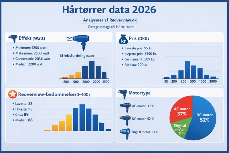 Denne analyse omfatter 48 hårtørrere, der alle kan købes på det danske marked i dag. Data kommer fra producenternes officielle specifikationer.