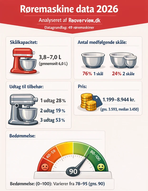 Denne artikel indeholder en dataanalyse af røremaskiner udarbejdet den 5. februar 2026. Analysen bygger på 49 røremaskiner, som alle kan købes på det danske marked i dag.