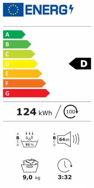 Alle tørretumblere i EU har et energimærke med de vigtigste oplysninger, bl.a. energiklasse og energiforbrug.