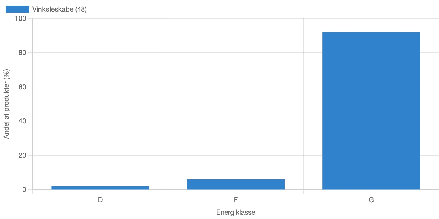 Delkonklusion: Langt de fleste vinkøleskabe er i energiklasse G. Generelt klarer vinkøleskabene sig dårligt i energiklassificeringen.
